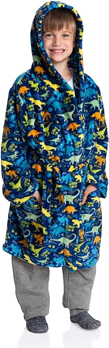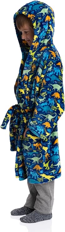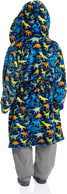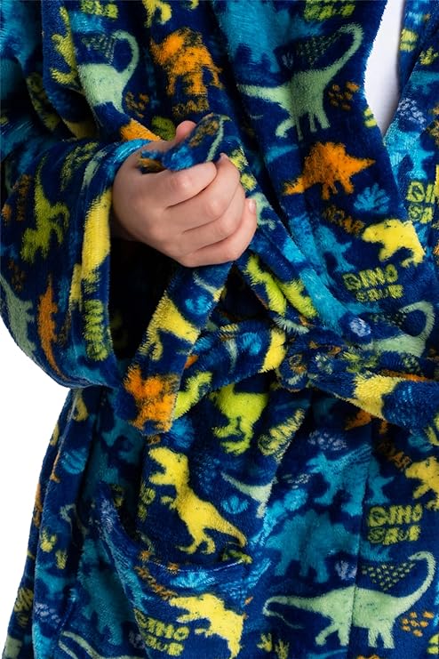 - 🌌 Function Meets Fantasy: Dive into plush warmth with this robe. Crafted for durability, warmth, and easy care, its added hood and pockets enhance functionality, making it the ideal choice for young dino enthusiasts.