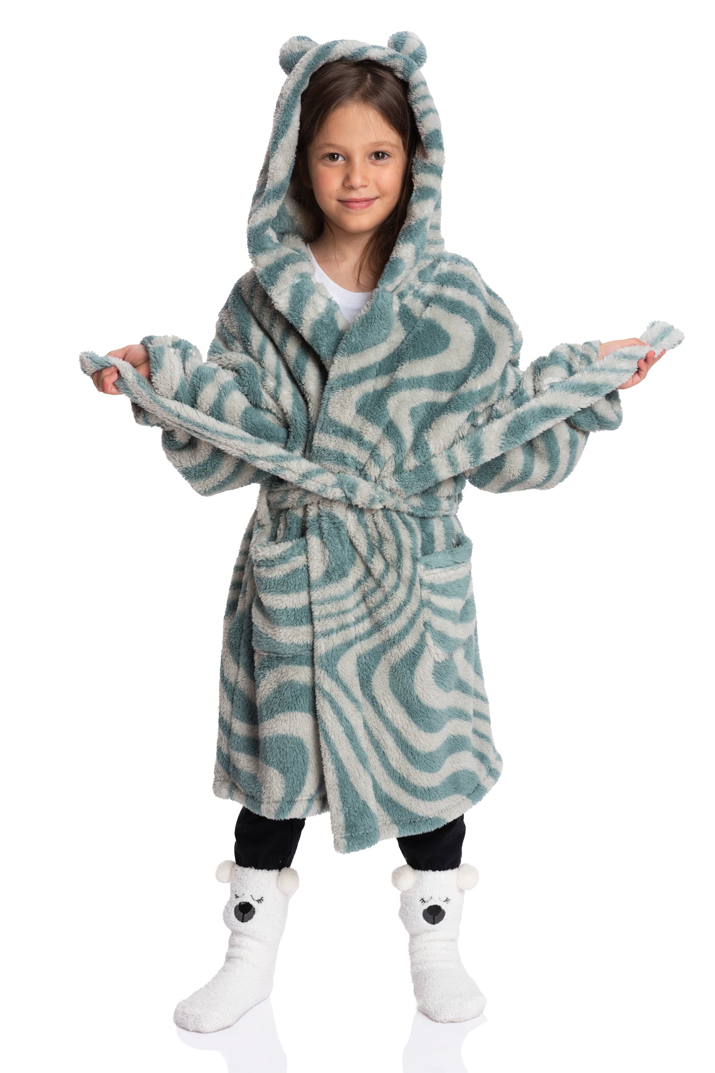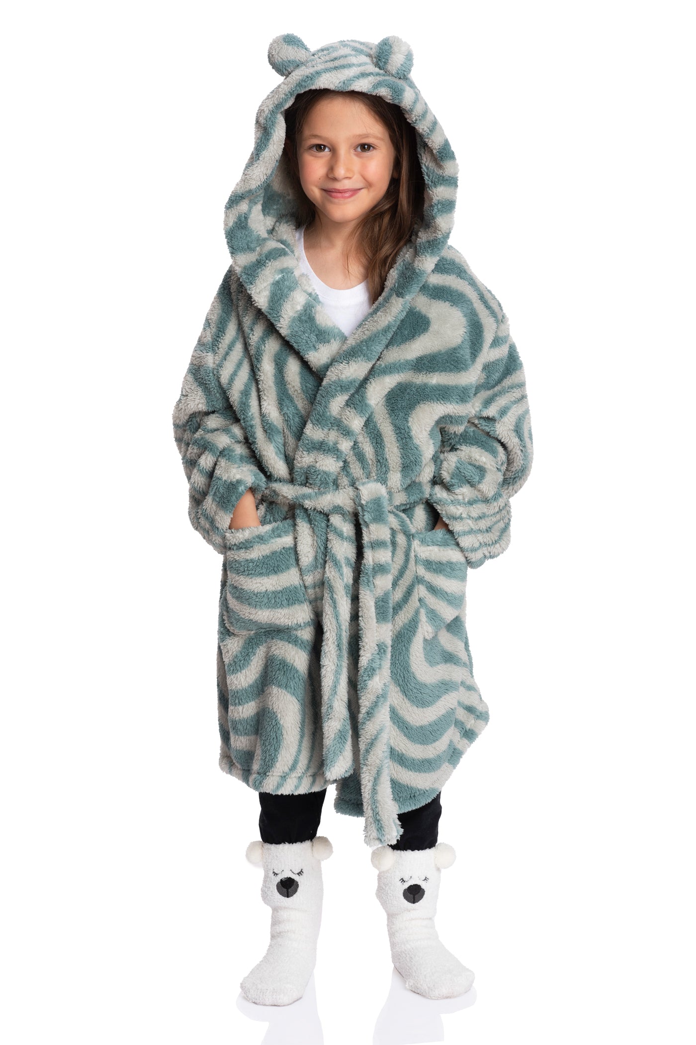 - 🌼 Soft & Adorable Design: Step into plush elegance with our Sherpa girls robe, adorned with a hoodie featuring teddy ears. Complete with front side pockets, long sleeves, and a self-fabric waistband, it promises both warmth and a perfect fit, all while offering a comfortable knee length.